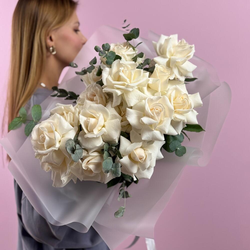Нежный букет из белых французских роз с эвкалиптом — это воплощение чистоты и утончённой элегантности. Белые розы Венделла, с их безупречно гладкими лепестками, создают утонченную композицию, а свежие веточки эвкалипта добавляют аромата и природной лёгкости. Дополнение эвкалипта придаёт букету свежесть и уникальный природный акцент, делая его идеальным подарком для самых особенных моментов: свадьба, букет для мамы, день рождения, юбилей или свидание с любимой девушкой.